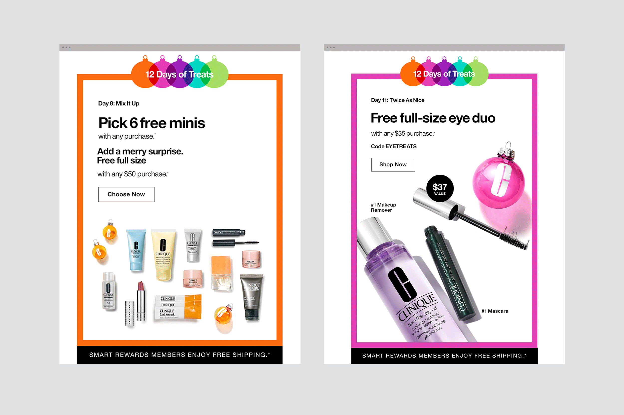 12 Days of Treats was the theme for Clinique’s 2018 Holiday campaign. I work across email and social media marketing to iterate on this theme.