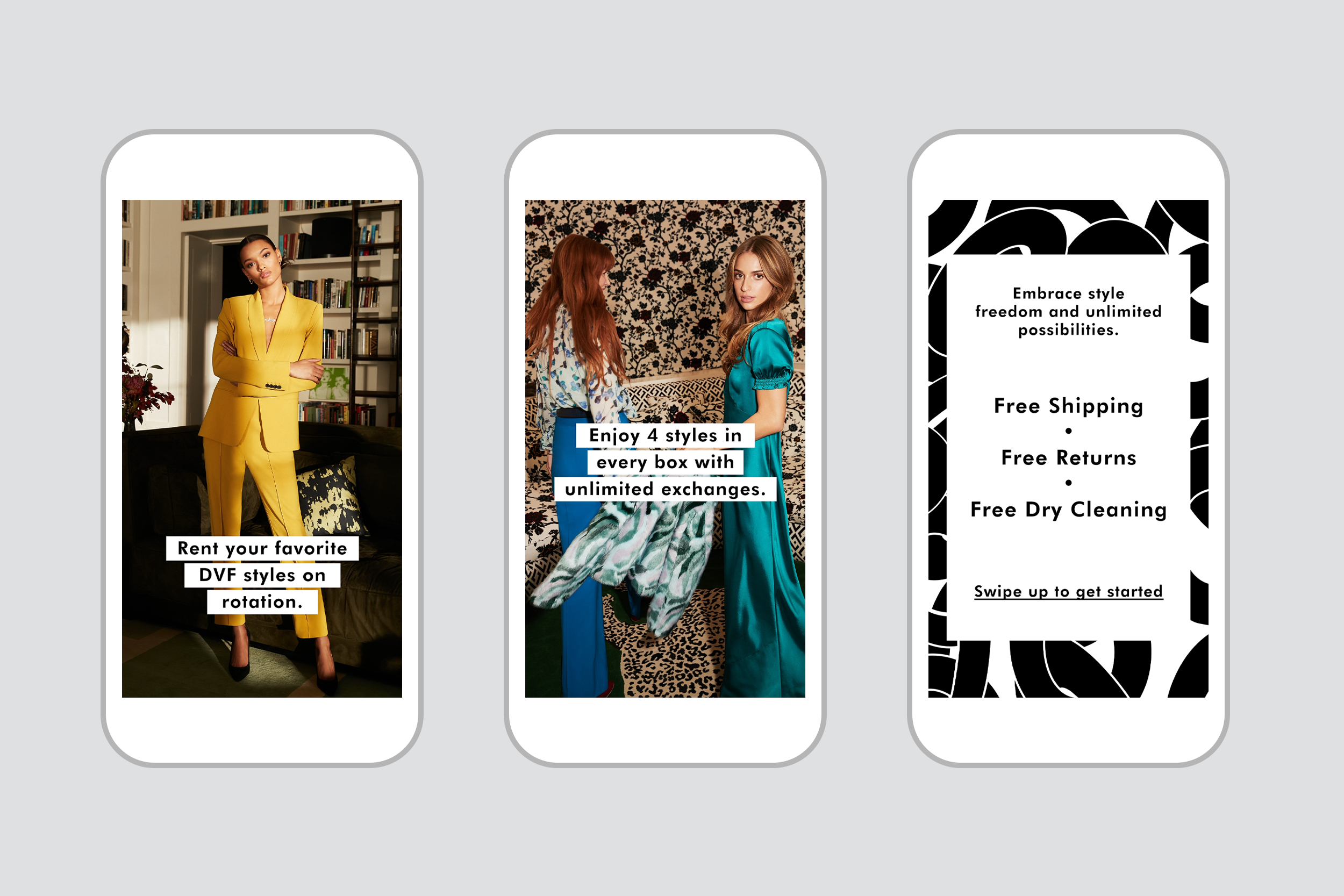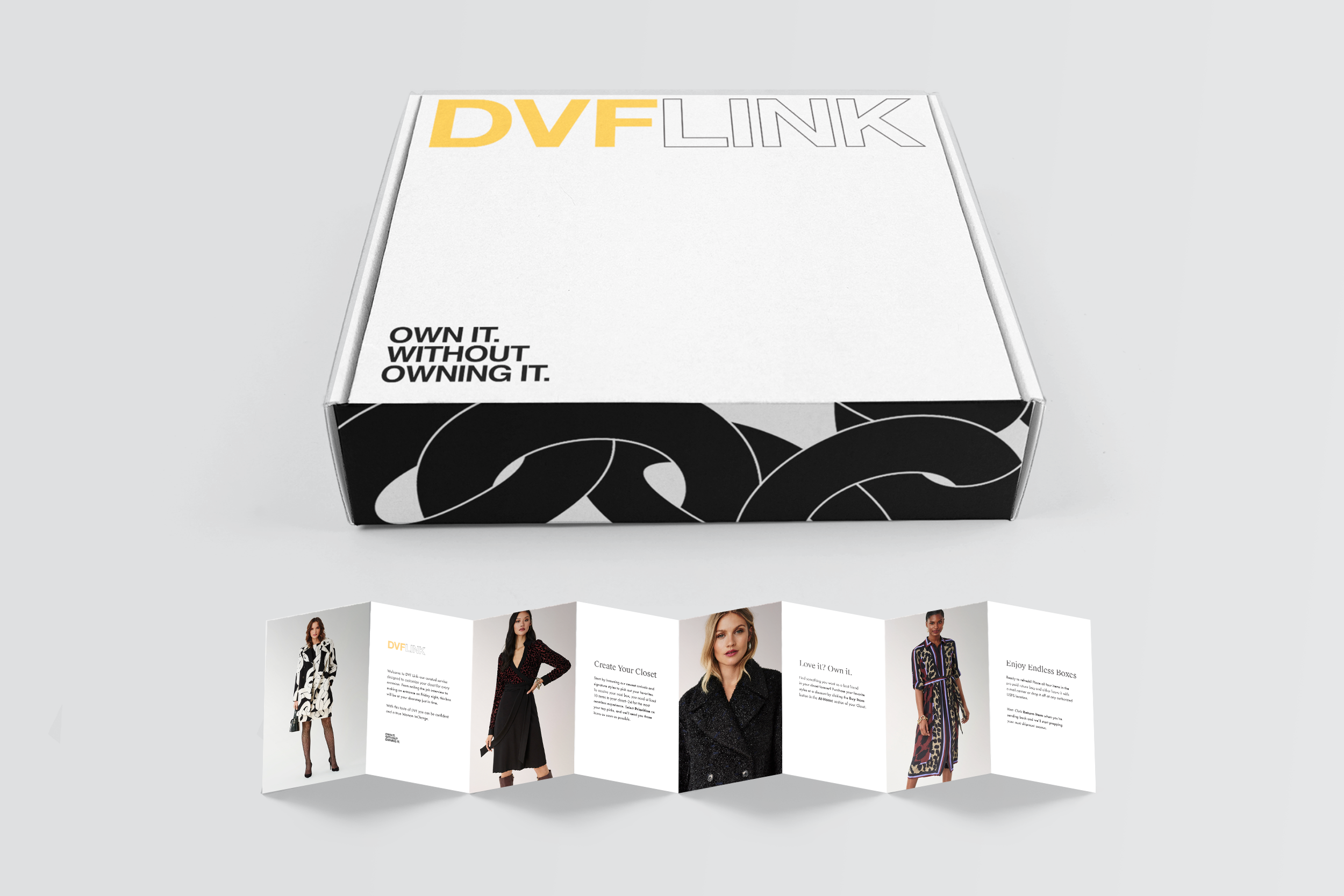 In this project, I translated the iconic DVF aesthetic into the branding for their new monthly rental service. The well-known chainlink pattern was used across the box, the print materials and the social media campaign.